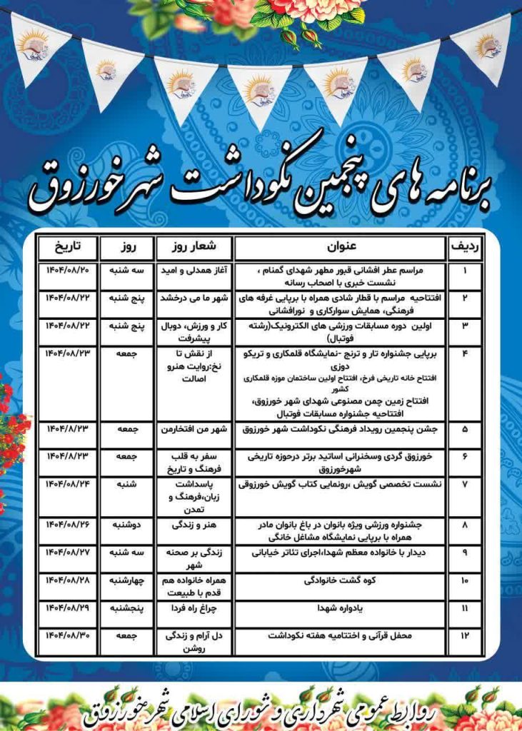 جدول برنامه های پنجمین سالگرد هفته نکوداشت شهر خورزوق